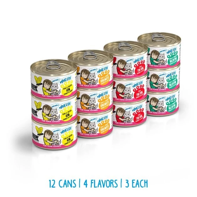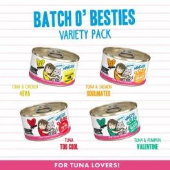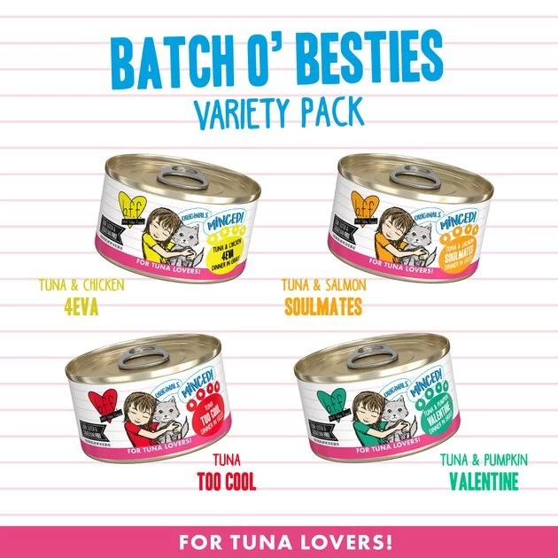 Turn meal time into yum time for your best feline friend with the BFF Batch ‘O Besties Variety Pack Canned Cat Food. Each delicious recipe is made with wild-caught tuna and wholesome proteins and veggies like salmon, chicken and pumpkin. The formulas are also loaded with essential vitamins, taurine, omegas, amino acids and minerals, so they provide a deliciously balanced, carnivore-based diet for all kitties. Since they’re packed with moisture from gravy, they’re a great way to add much-needed hydration to keep your little hunter healthy. Plus, it’s all made with sustainably-sourced, dolphin-safe ingredients in state-of-the-art food facilities with nothing artificial.