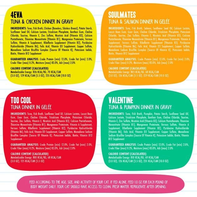 Tuna & Salmon Soulmates: Tuna, Fish Broth, Salmon, Sunflower Seed Oil, Calcium Lactate, Locust Bean Gum, Guar Gum, Choline Chloride, Tricalcium Phosphate, Potassium Chloride, Taurine, Zinc Sulfate, Vitamin E, Nicotinic Acid (Vitamin B3), Calcium Pantothenate, Thiamine Mononitrate (Vitamin B1), Manganese Proteinate, Vitamin A Supplement, Ferrous Sulfate, Riboflavin Supplement (Vitamin B2), Pyridoxine Hydrochloride (Vitamin B6), Folic Acid, Vitamin D3 Supplement, Copper Sulfate, Menadione Sodium Bisulfite Complex (Source Of Vitamin K), Potassium Iodide, Biotin, Vitamin B12 Supplement.