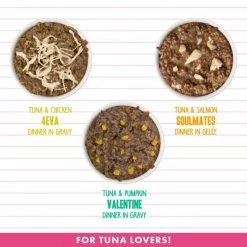 - Grain-free wet food variety pack with real meat including tuna, chicken and salmon in aspic and gravy recipes.