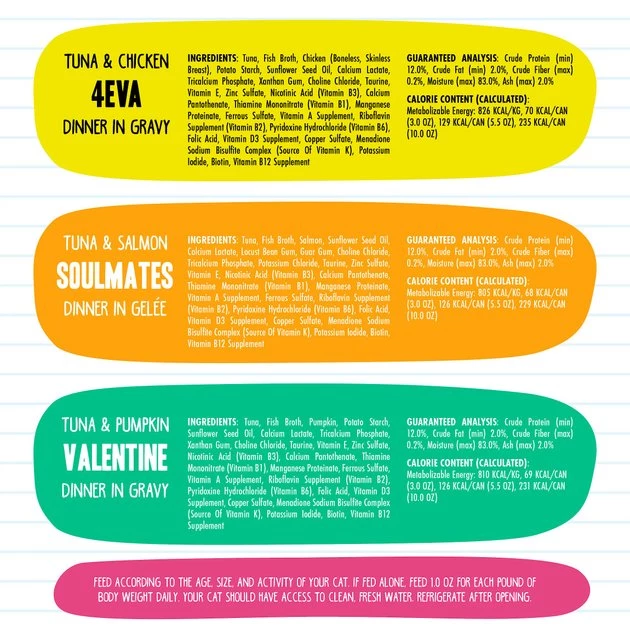 Tuna & Salmon Soulmates: Tuna, Fish Broth, Salmon, Sunflower Seed Oil, Calcium Lactate, Locust Bean Gum, Guar Gum, Choline Chloride, Tricalcium Phosphate, Potassium Chloride, Taurine, Zinc Sulfate, Vitamin E, Nicotinic Acid (Vitamin B3), Calcium Pantothenate, Thiamine Mononitrate (Vitamin B1), Manganese Proteinate, Vitamin A Supplement, Ferrous Sulfate, Riboflavin Supplement (Vitamin B2), Pyridoxine Hydrochloride (Vitamin B6), Folic Acid, Vitamin D3 Supplement, Copper Sulfate, Menadione Sodium Bisulfite Complex (Source Of Vitamin K), Potassium Iodide, Biotin, Vitamin B12 Supplement.