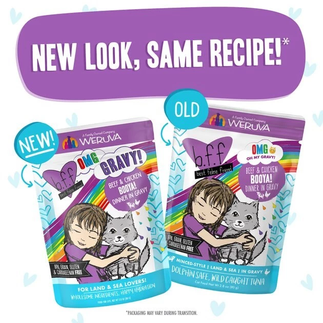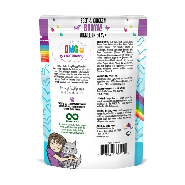 Turn meal time into yum time for your best feline friend with the BFF OMG Booya! Beef & Chicken Dinner in Gravy Grain-Free Cat Food Pouches. Made with beef broth, grass-fed beef and cage-free chicken as the top ingredients, plus essential vitamins and minerals, it provides a gravylicious and balanced diet for adult kitties. Since it’s packed with broth, it’s a great way to add much-needed hydration to keep your pal healthy. Plus, it’s made with sustainably sourced ingredients in state of the art food facilities with nothing artificial.