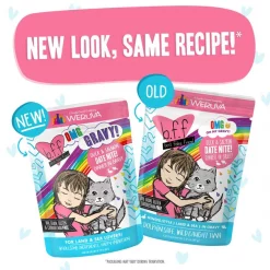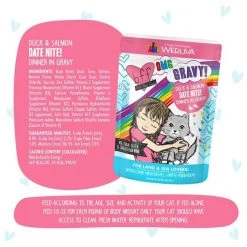 Turn meal time into date night for your best feline friend with the BFF OMG Date Nite! Duck & Salmon Dinner in Gravy Grain-Free Cat Food Pouches. Made with duck broth, duck and salmon as the top ingredients, plus essential vitamins and minerals, it provides a gravylicious and balanced diet for adult kitties. Since it’s packed with broth, it’s a great way to add much-needed hydration to keep your pal healthy. Plus, it’s made with sustainably sourced ingredients in state of the art food facilities with nothing artificial.
