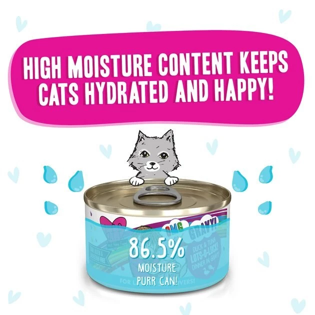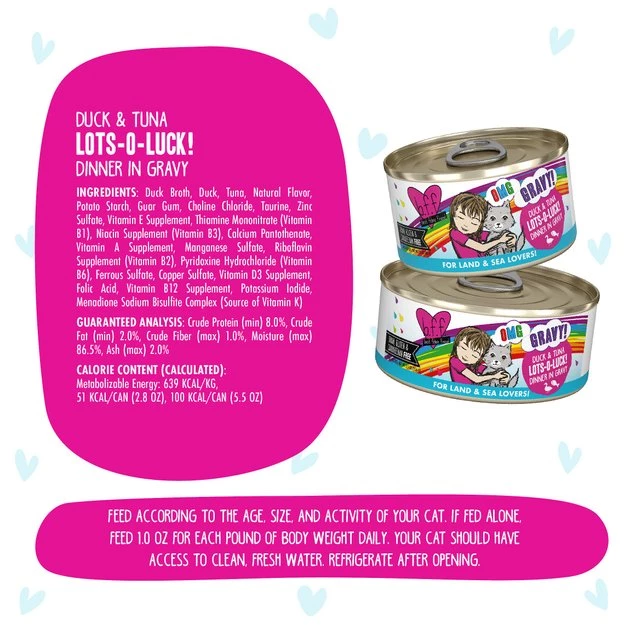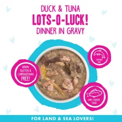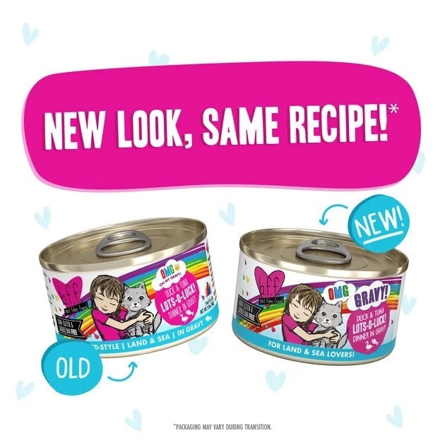 Turn meal time into yum time for your best feline friend with the BFF OMG Lots-O-Luck! Duck & Tuna Dinner in Gravy Grain-Free Canned Cat Food. Made with duck broth, duck and tuna as the top ingredients, plus essential vitamins and minerals, it provides a gravylicious and balanced diet for adult kitties. Since it’s packed with broth, it’s a great way to add much-needed hydration to keep your pal healthy. Plus, it’s made with sustainably sourced ingredients in state of the art food facilities with nothing artificial.