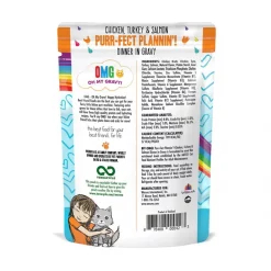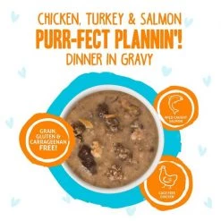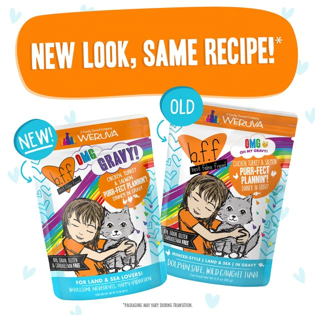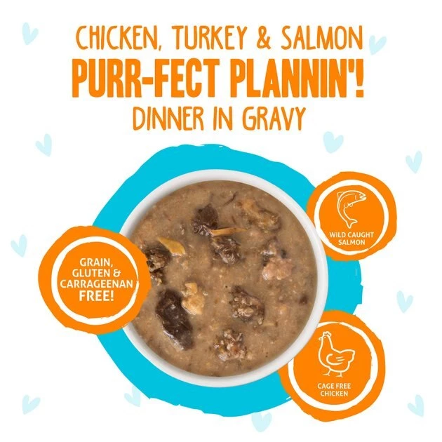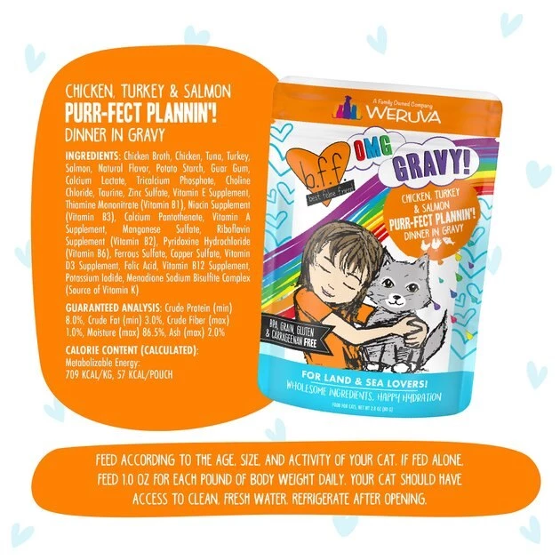 Turn meal time into yum time for your best feline friend with the BFF OMG Purr-Fect Plannin’! Chicken, Turkey & Salmon Dinner in Gravy Grain-Free Cat Food Pouches. Made with chicken broth, chicken, turkey and salmon as the top ingredients, plus essential vitamins and minerals, it provides a gravylicious and balanced diet for adult kitties. Since it’s packed with broth, it’s a great way to add much-needed hydration to keep your pal healthy. Plus, it’s made with sustainably sourced ingredients in high-quality food facilities with nothing artificial.