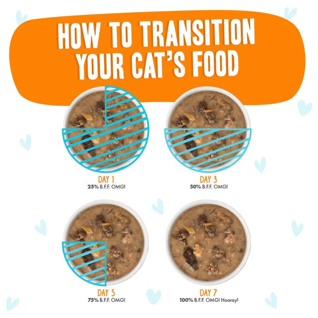 Despite how much your feline friends ask for BFF’s high-quality foods, it’s best to transition them gradually onto a new food over a week. Start by mixing a small amount of BFF in with their old food and slowly increase the amount of BFF fed over 7 days. This will help your kitty to adjust to their new BFF foods � Because WeLuvya