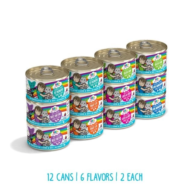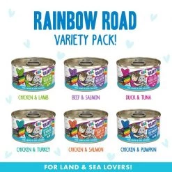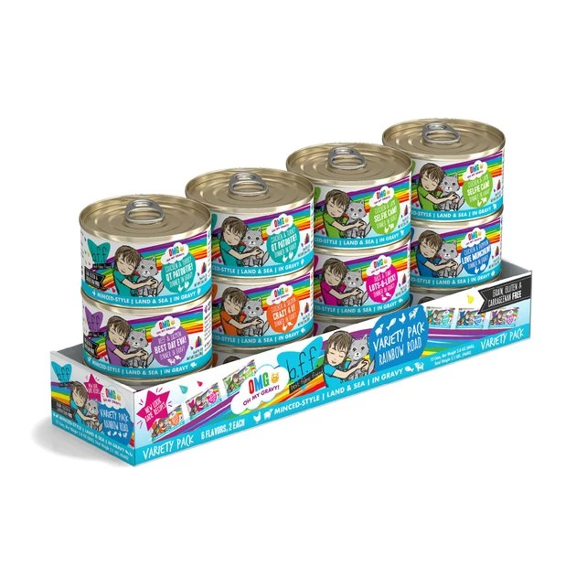 Treat your best feline friend to the hydration-packed nutrition of the BFF OMG Rainbow Road Variety Pack Grain-Free Canned Cat Food. “Give me meow gravy,” says your furry bestie, so open up a can for a culinary experience in every bowl. The variety pack includes recipes with real meat as the top ingredient, like beef, salmon, tuna, chicken, turkey, lamb and others, for protein to support healthy muscles. Every bite is loaded with vitamins, minerals and antioxidants for overall health, and lots of hydration from real broth!