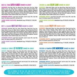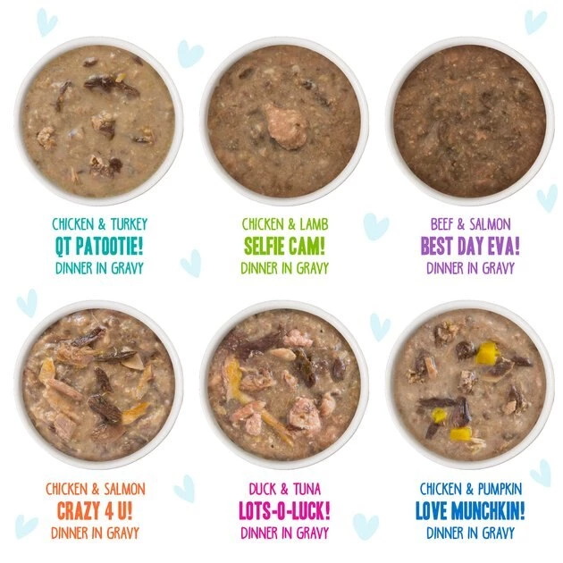 QT Patootie! Chicken & Turkey Dinner in Gravy: 683 kcal/kg; Best Day Eva! Beef & Salmon Dinner in Gravy: 574 kcal/kg; Crazy 4 U! Chicken & Salmon Dinner in Gravy: 711 kcal/kg; Selfie Cam! Chicken & Lamb Dinner in Gravy: 852 kcal/kg; Lots-O-Luck! Duck & Tuna Dinner in Gravy: 639 kcal/kg; Love Munchkin! Chicken & Pumpkin Dinner in Gravy: 688 kcal/kg