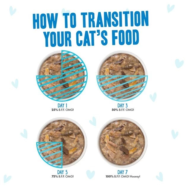 Despite how much your feline friends ask for BFF’s high-quality foods, it’s best to transition them gradually onto a new food over a week. Start by mixing a small amount of BFF in with their old food and slowly increase the amount of BFF fed over 7 days. This will help your kitty to adjust to their new BFF foods � Because WeLuvya