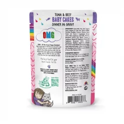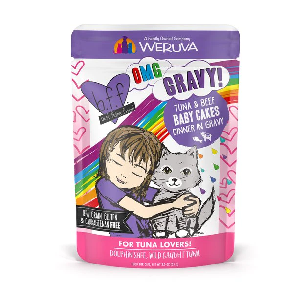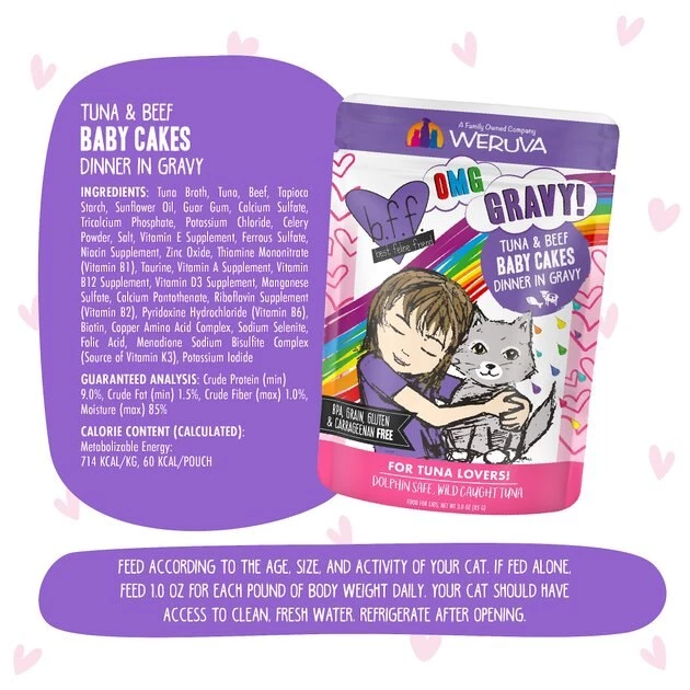 Turn meal time into yum time for your best feline friend with the BFF Tuna & Beef Baby Cakes Dinner in Gravy Wet Cat Food Pouches. Made with wild-caught tuna and tender beef as the top ingredients, plus essential vitamins, taurine, omegas, amino acids and minerals, it provides a deliciously balanced, carnivore-based diet for all kitties. Since it’s packed with gravy made with broth, it’s a great way to add much-needed hydration to keep your little hunter healthy. Plus, it’s made with sustainably sourced ingredients in state of the art food facilities with nothing artificial.