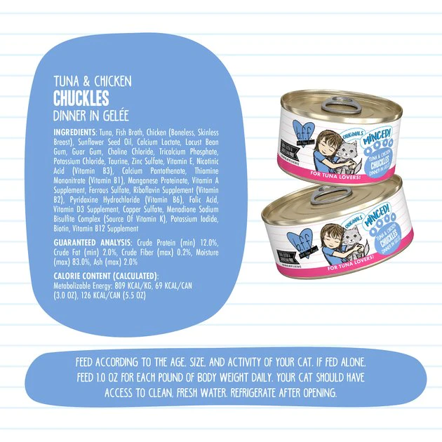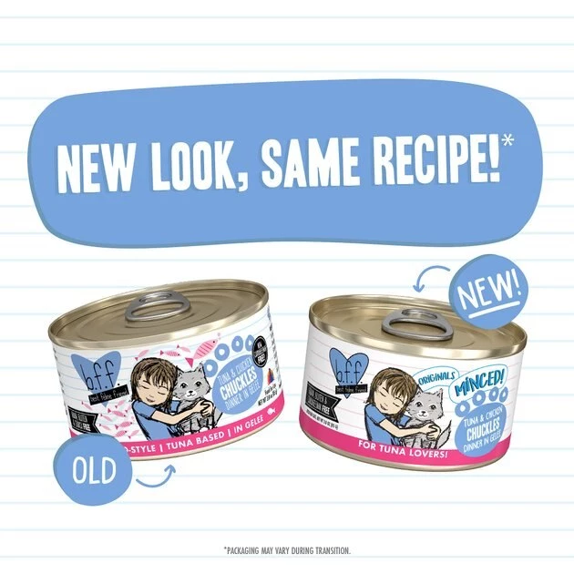 Turn meal time into yum time for your best feline friend with the BFF Tuna & Chicken Chuckles with Tuna & Chicken in Aspic Canned Cat Food. Made with wild-caught tuna and chicken as the top ingredients, plus essential vitamins, taurine, amino acids and minerals, it provides a deliciously balanced, carnivore-based diet for all kitties. Since it’s packed with broth, it’s a great way to add much-needed hydration to keep your little hunter healthy. Plus, it’s made with sustainably sourced ingredients in state of the art food facilities with nothing artificial.