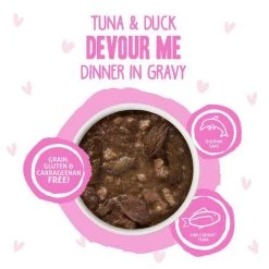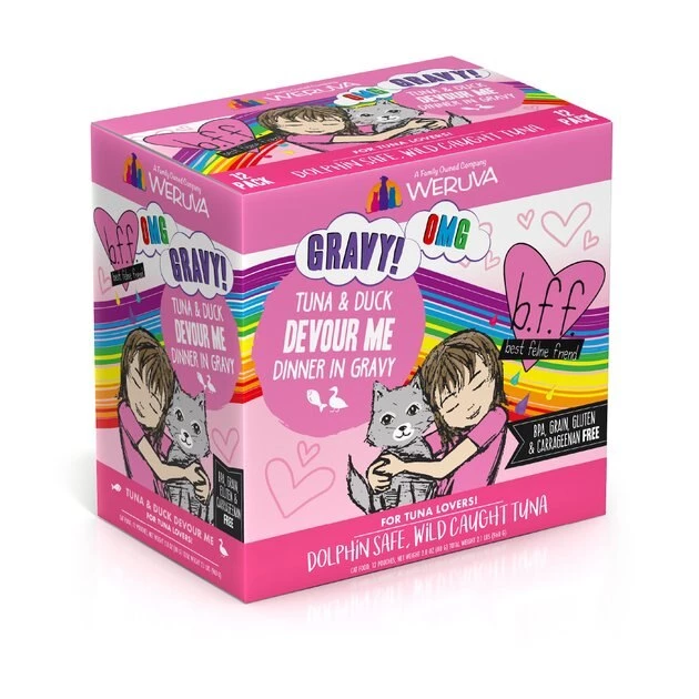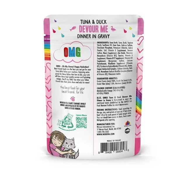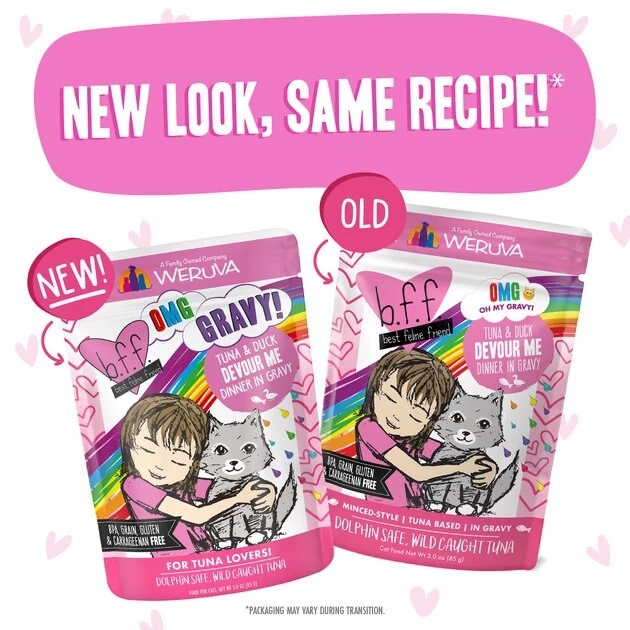 Turn meal time into yum time for your best feline friend with the BFF Tuna & Duck Devour Me Dinner in Gravy Wet Cat Food Pouches. Made with wild-caught tuna and tasty duck as the top ingredients, plus essential vitamins, taurine, omegas, amino acids and minerals, it provides a deliciously balanced, carnivore-based diet for all kitties. Since it’s packed with gravy made with broth, it’s a great way to add much-needed hydration to keep your little hunter healthy. Plus, it’s made with sustainably-sourced ingredients in state of the art food facilities with nothing artificial.