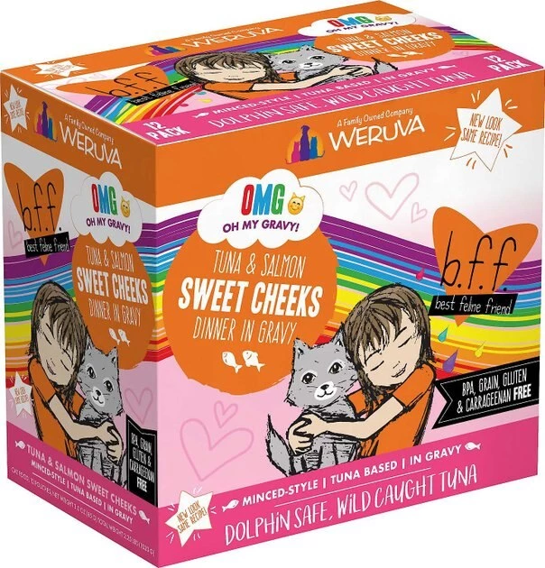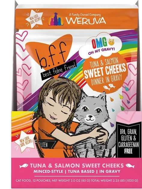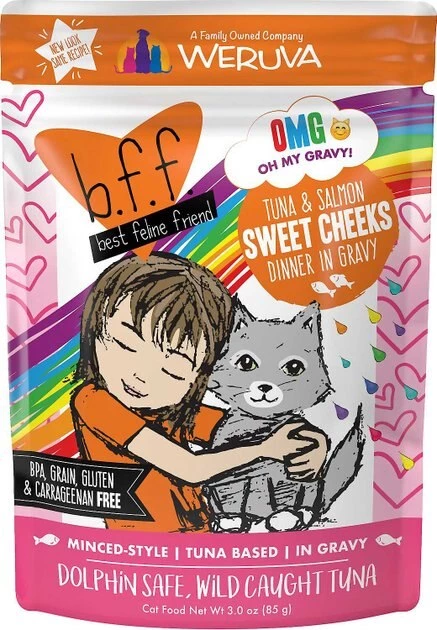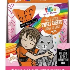 Turn meal time into yum time for your best feline friend with the BFF Tuna & Salmon Sweet Cheeks Dinner in Gravy Wet Cat Food Pouches. Made with wild-caught tuna and savory salmon as the top ingredients, plus essential vitamins, taurine, omegas, amino acids and minerals, it provides a deliciously balanced, carnivore-based diet for all kitties. Since it’s packed with gravy made with broth, it’s a great way to add much-needed hydration to keep your little hunter healthy. Plus, it’s made with sustainably-sourced ingredients in state of the art food facilities with nothing artificial.