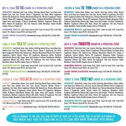 Can One (Chicken & Tuna Til’ Then): Chicken Broth, Chicken, Tuna, Sardine, Dried Egg, Calcium Sulfate, Natural Flavor, Locust Bean Gum, Xanthan Gum, Guar Gum, Taurine, Vitamin E Supplement, Zinc Oxide, Niacin Supplement (Vitamin B3), Reduced Iron, Thiamine Mononitrate (Vitamin B1), Vitamin A Supplement, Sodium Selenite, Vitamin B12 Supplement, Potassium Chloride, Manganese Sulfate, Pyridoxine Hydrochloride (Vitamin B6), Copper Amino Acid Complex, Calcium Pantothenate, Riboflavin Supplement (Vitamin B2), Biotin, Vitamin D3 Supplement, Folic Acid, Potassium Iodide, Menadione Sodium Bisulfite Complex (Source of Vitamin K). Can Two (Salmon & Tuna Tuck Me In): Salmon Broth, Salmon, Tuna, Sardine, Dried Egg, Natural Flavor, Calcium Sulfate, Locust Bean Gum, Xanthan Gum, Guar Gum, Taurine, Potassium Chloride, Vitamin E Supplement, Zinc Oxide, Niacin Supplement (Vitamin B3), Reduced Iron, Thiamine Mononitrate (Vitamin B1), Vitamin A Supplement, Sodium Selenite, Vitamin B12 Supplement, Manganese Sulfate, Pyridoxine Hydrochloride (Vitamin B6), Copper Amino Acid Complex, Calcium Pantothenate, Riboflavin Supplement (Vitamin B2), Biotin, Vitamin D3 Supplement, Folic Acid, Potassium Iodide, Menadione Sodium Bisulfite Complex (Source of Vitamin K). Can Three (Beef & Tuna Tic Toc): Beef Broth, Beef, Tuna, Sardine, Dried Egg, Natural Flavor, Locust Bean Gum, Xanthan Gum, Guar Gum, Taurine, Vitamin E Supplement, Zinc Oxide, Niacin Supplement (Vitamin B3), Reduced Iron, Thiamine Mononitrate (Vitamin B1), Vitamin A Supplement, Sodium Selenite, Vitamin B12 Supplement, Manganese Sulfate, Pyridoxine Hydrochloride (Vitamin B6), Copper Amino Acid Complex, Calcium Pantothenate, Riboflavin Supplement (Vitamin B2), Biotin, Vitamin D3 Supplement, Folic Acid, Potassium Iodide, Menadione Sodium Bisulfite Complex (Source of Vitamin K). Can Four (Duck & Tuna Trickster): Duck Broth, Duck, Tuna, Sardine, Dried Egg, Natural Flavor, Locust Bean Gum, Xanthan Gum, Guar Gum, Taurine, Vitamin E Supplement, Potassium Chloride, Zinc Oxide, Niacin Supplement (Vitamin B3), Reduced Iron, Thiamine Mononitrate (Vitamin B1), Vitamin A Supplement, Sodium Selenite, Vitamin B12 Supplement, Manganese Sulfate, Pyridoxine Hydrochloride (Vitamin B6), Copper Amino Acid Complex, Calcium Pantothenate, Riboflavin Supplement (Vitamin B2), Biotin, Vitamin D3 Supplement, Folic Acid, Potassium Iodide, Menadione Sodium Bisulfite Complex (Source of Vitamin K). Can Five (Turkey & Tuna Tweet Me!): Turkey Broth, Turkey, Tuna, Sardine, Dried Egg, Natural Flavor, Calcium Sulfate, Locust Bean Gum, Xanthan Gum, Guar Gum, Taurine, Potassium Chloride, Vitamin E Supplement, Zinc Oxide, Niacin Supplement (Vitamin B3), Reduced Iron, Thiamine Mononitrate (Vitamin B1), Vitamin A Supplement, Sodium Selenite, Vitamin B12 Supplement, Manganese Sulfate, Pyridoxine Hydrochloride (Vitamin B6), Copper Amino Acid Complex, Calcium Pantothenate, Riboflavin Supplement (Vitamin B2), Biotin, Vitamin D3 Supplement, Folic Acid, Potassium Iodide, Menadione Sodium Bisulfite Complex (Source of Vitamin K). Can Six (Lamb & Tuna Told Ya’): Lamb Broth, Lamb, Tuna, Sardine, Dried Egg, Natural Flavor, Locust Bean Gum, Xanthan Gum, Guar Gum, Potassium Chloride, Taurine, Vitamin E Supplement, Zinc Oxide, Niacin Supplement (Vitamin B3), Reduced Iron, Thiamine Mononitrate (Vitamin B1), Vitamin A Supplement, Sodium Selenite, Vitamin B12 Supplement, Manganese Sulfate, Pyridoxine Hydrochloride (Vitamin B6), Copper Amino Acid Complex, Calcium Pantothenate, Riboflavin Supplement (Vitamin B2), Biotin, Vitamin D3 Supplement, Folic Acid, Potassium Iodide, Menadione Sodium Bisulfite Complex (Source of Vitamin K).