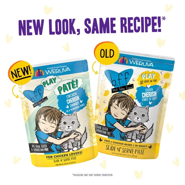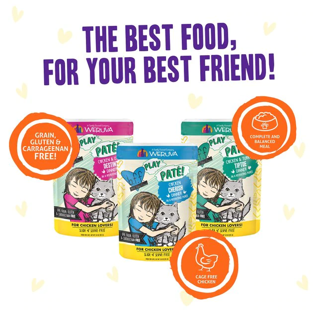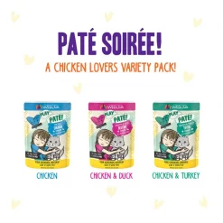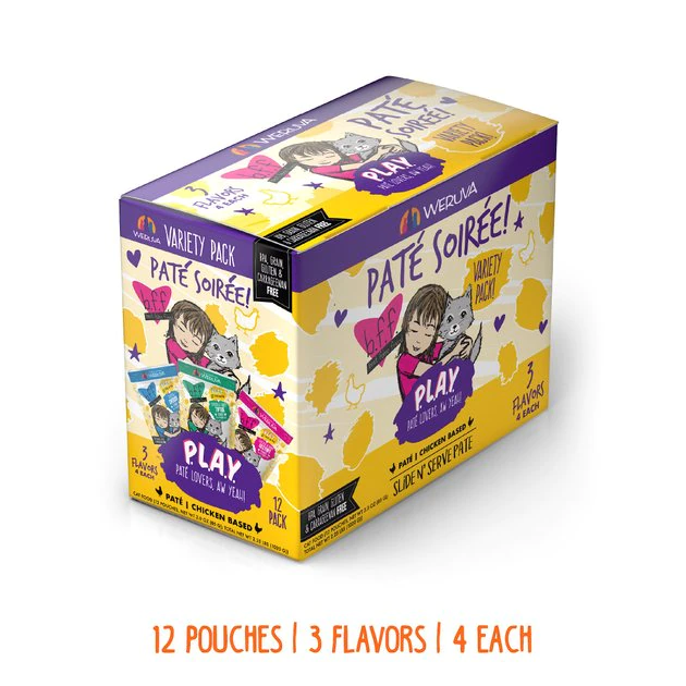 Your feline friend will be purring with delight once she tries this Weruva Best Feline Friend Paté Lovers, Aw Yeah! Paté Soiree! Variety Pack Grain-Free Wet Cat Food! This variety pack contains three all-natural wet cat food recipes made with land and sea proteins. These recipes deliver the protein and moisture your cat needs in her diet and they are low in carbs and fat. And since they come in Slide N’ Serve Pouches, each meal is paws-tively easy to serve! You can have peace of mind knowing that the recipes in this variety pack are made without grains, gluten, starch, carrageenan, corn, wheat, soy or artificial colors or preservatives. Your cat companion will love this variety pack and so will you!