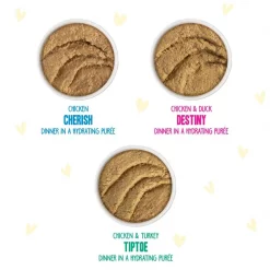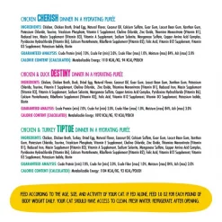 Chicken & Duck Destiny: Chicken, Chicken Broth, Duck, Dried Egg, Natural Flavor, Coconut Oil, Guar Gum, Locust Bean Gum, Xanthan Gum, Potassium Chloride, Taurine, Vitamin E Supplement, Choline Chloride, Zinc Oxide, Thiamine Mononitrate (Vitamin B1), Reduced Iron, Niacin Supplement (Vitamin B3), Vitamin A Supplement, Sodium Selenite, Manganese Sulfate, Copper Amino Acid Complex, Pyridoxine Hydrochloride (Vitamin B6), Calcium Pantothenate, Riboflavin Supplement (Vitamin B2), Folic Acid, Vitamin B12 Supplement, Vitamin D3 Supplement, Potassium Iodide, Biotin.