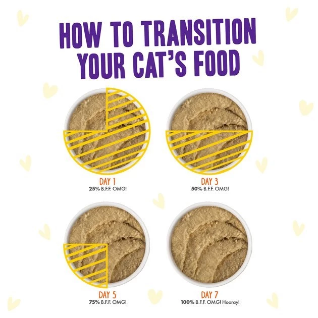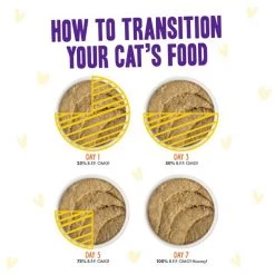 To transition your cat, mix new food gradualy into your cat’s current food over 7 days.