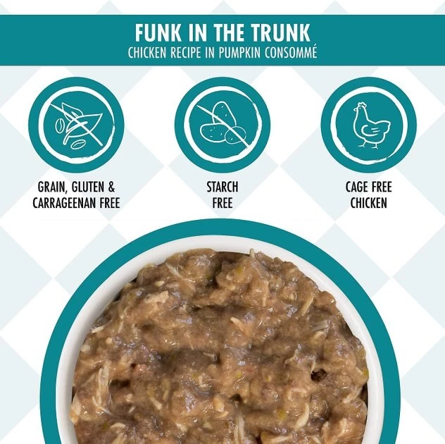 Funk in the Trunk: Chicken Broth, Chicken (Boneless, Skinless Breast), Tuna, Pumpkin, Sunflower Seed Oil, Calcium Lactate, Locust Bean Gum, Tricalcium Phosphate, Fish Oil, Guar Gum, Xanthan Gum, Potassium Chloride, Choline Chloride, Taurine, Zinc Sulfate, Vitamin E Supplement, Nicotinic Acid (Vitamin B3), Thiamine Mononitrate (Vitamin B1), Manganese Proteinate, Calcium Pantothenate, Vitamin A Supplement, Ferrous Sulfate, Riboflavin Supplement (Vitamin B2), Pyridoxine Hydrochloride (Vitamin B6), Folic Acid, Copper Sulfate, Vitamin D3 Supplement, Potassium Iodide, Biotin, Vitamin B12 Supplement.