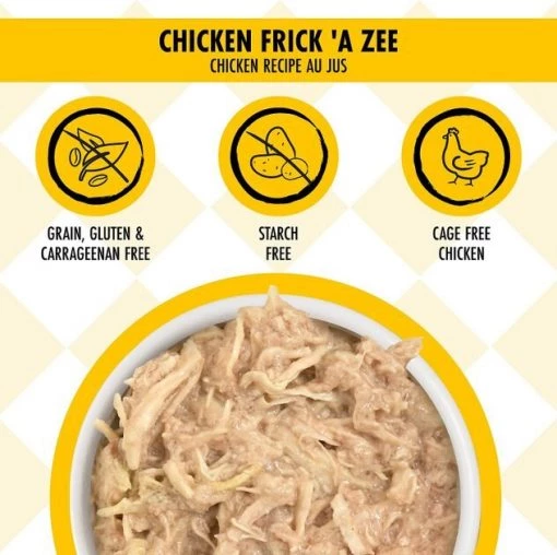 Chicken Frick ‘A Zee: Chicken, Chicken Broth, Sunflower Seed Oil, Locust Bean Gum, Calcium Lactate, Guar Gum, Xanthan Gum, Tricalcium Phosphate, Potassium Chloride, Fish Oil, Choline Chloride, Taurine, Zinc Sulfate, Vitamin E Supplement, Nicotinic Acid (Vitamin B3), Ferrous Sulfate, Manganese Proteinate, Thiamine Mononitrate (Vitamin B1), Calcium Pantothenate, Vitamin A Supplement, Riboflavin Supplement (Vitamin B2), Pyridoxine Hydrochloride (Vitamin B6), Copper Sulfate, Vitamin D3 Supplement, Folic Acid, Potassium Iodide, Sodium Selenite, Biotin, Vitamin B12 Supplement.