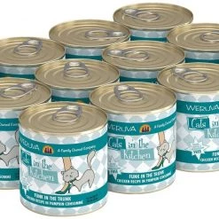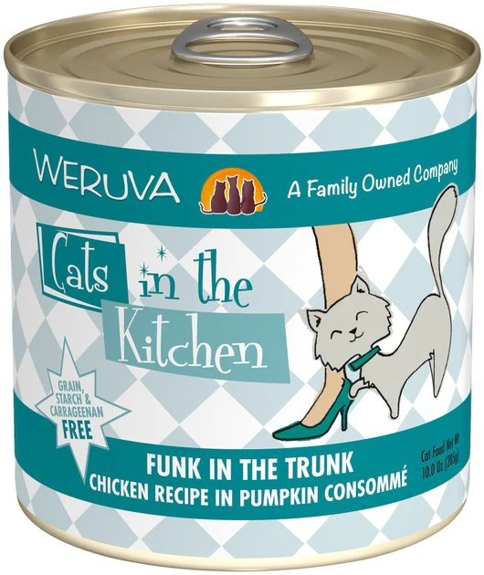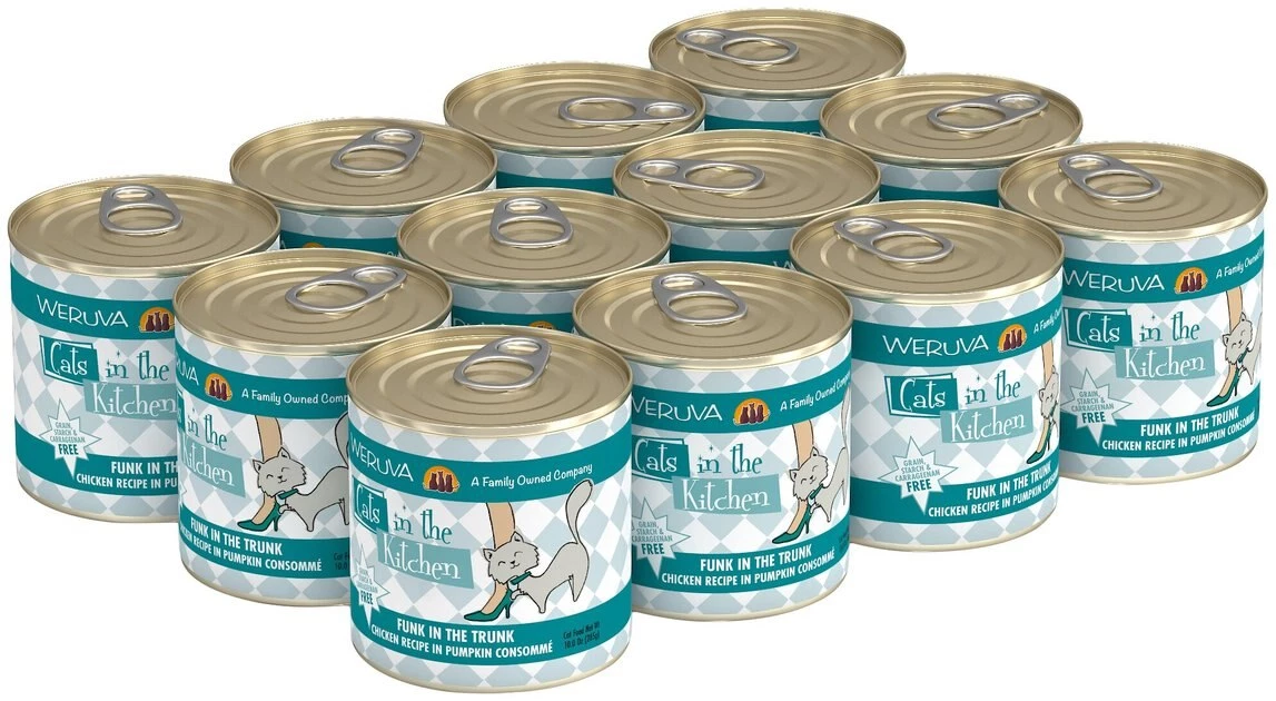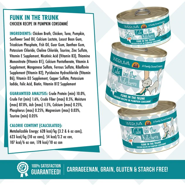 Your kitty loves hanging out in the kitchen, so give him the home-cooked flavor he craves with the Weruva Cats in the Kitchen Funk In The Trunk Chicken in Pumpkin Consomme Grain-Free Canned Cat Food. Made with lean chicken breast and wholesome pumpkin as the top ingredients, every bite is loaded with the meat your little carnivore craves, and all the protein he needs for healthy muscles. Since it’s formulated with a perfectly-balanced blend of vitamins, minerals and heart-healthy taurine, every easy-open can is actually a complete meal—on its own or as a tasty kibble topper. So open a can, serve up and bring on all that quality time in the kitchen!