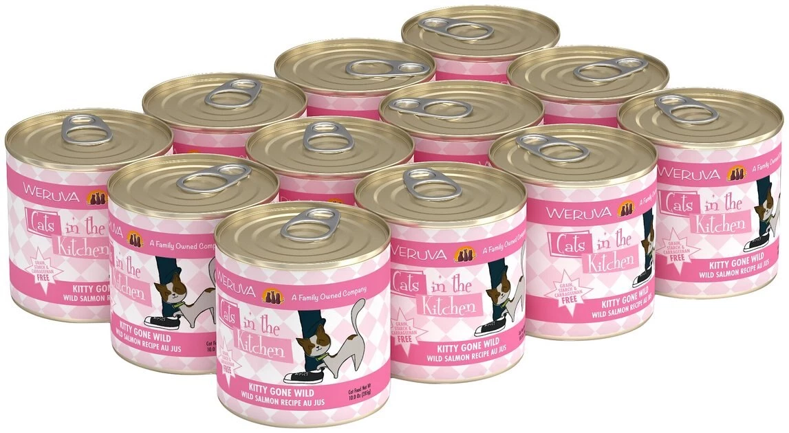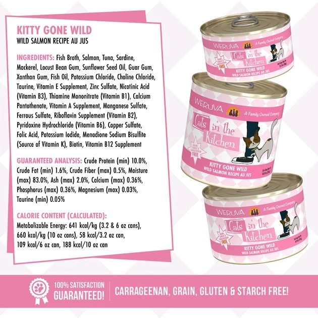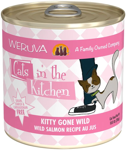 Your kitty loves hanging out in the kitchen, so give him the home-cooked flavor he craves with the Weruva Cats in the Kitchen Kitty Gone Wild, Wild Salmon Au Jus Grain-Free Canned Cat Food. Made with wild salmon, tuna, and sardine as the top ingredients, every bite is loaded with the meat your little carnivore craves, and all the protein he needs for healthy muscles. Since it’s formulated with a perfectly-balanced blend of vitamins, minerals and heart-healthy taurine, every easy-open can is actually a complete meal—on its own or as a tasty kibble topper. So open a can, serve up and bring on all that quality time in the kitchen!