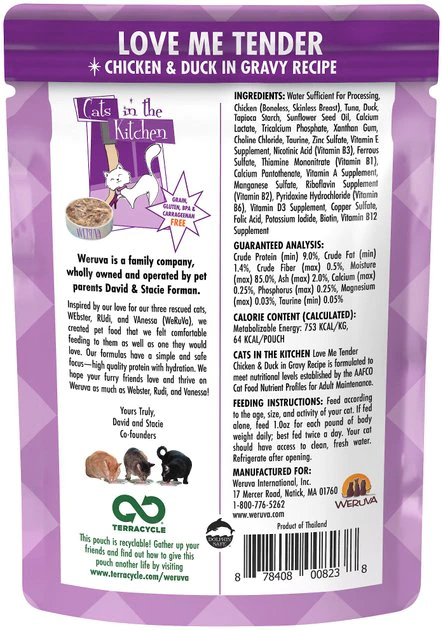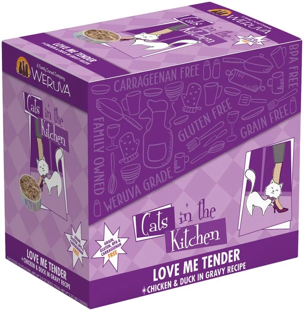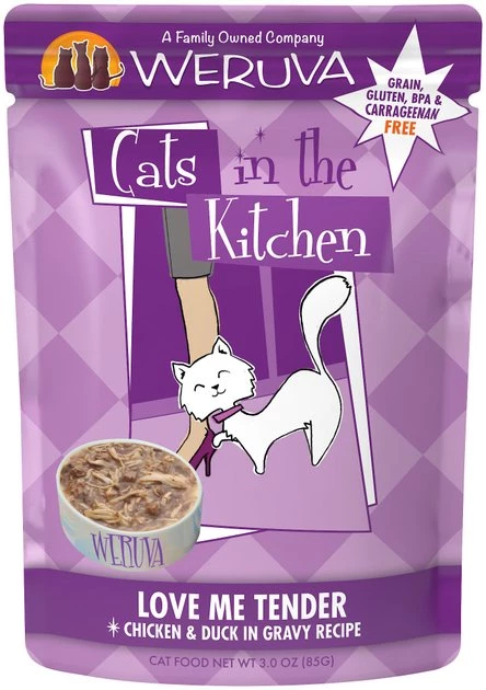 Your kitty loves hanging out in the kitchen, so give him the home-cooked flavor he craves with the Weruva Cats in the Kitchen Love Me Tender Chicken & Duck Recipe Grain-Free Cat Food Pouches. Made with chicken and duck as the top ingredients, every bite is loaded with the meat your little carnivore craves, and all the protein he needs for healthy muscles. Since it’s formulated with a perfectly-balanced blend of vitamins, minerals and heart-healthy taurine, every easy-open pouch is actually a complete meal—on its own or as a tasty kibble topper. Tear one open, serve up and bring on all that quality time in the kitchen!