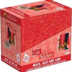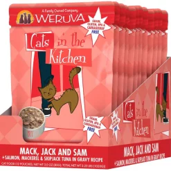 Your kitty loves hanging out in the kitchen, so give him the home-cooked flavor he craves with the Weruva Cats in the Kitchen Mack, Jack & Sam Salmon, Mackerel & Tuna Recipe Grain-Free Cat Food Pouches. Made with salmon, mackerel and tuna as the top ingredients, every bite is loaded with the meat your little carnivore craves, and all the protein he needs for healthy muscles. Since it’s formulated with a perfectly-balanced blend of vitamins, minerals and heart-healthy taurine, every easy-open pouch is actually a complete meal—on its own or as a tasty kibble topper. Tear one open, serve up and bring on all that quality time in the kitchen!