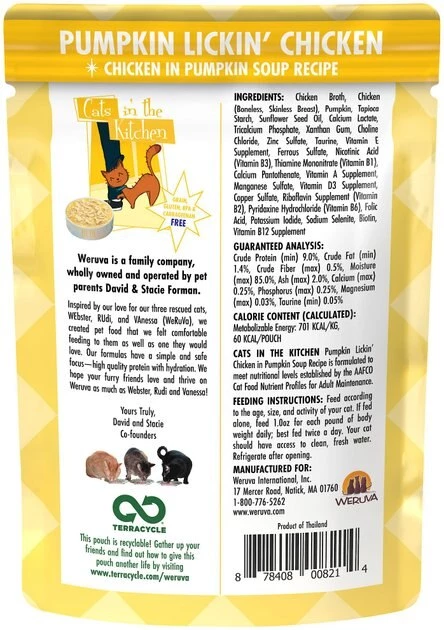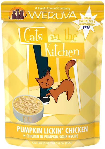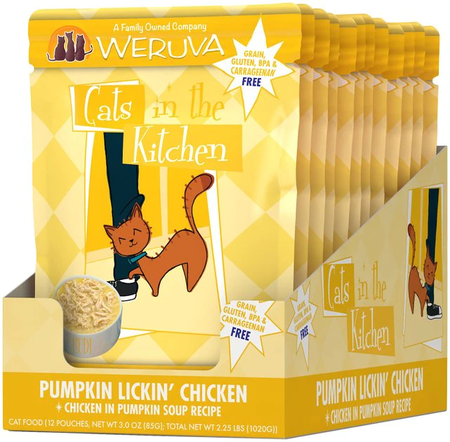 Your kitty loves hanging out in the kitchen, so give him the home-cooked flavor he craves with the Weruva Cats in the Kitchen Pumpkin Lickin’ Chicken in Pumpkin Soup Grain-Free Cat Food Pouches. Made with lean chicken and wholesome pumpkin as the top ingredients, every bite is loaded with the meat your little carnivore craves, and all the protein he needs for healthy muscles. Since it’s formulated with a perfectly-balanced blend of vitamins, minerals and heart-healthy taurine, every easy-open pouch is actually a complete meal—on its own or as a tasty kibble topper. So tear one open, serve up and bring on all that quality time in the kitchen!