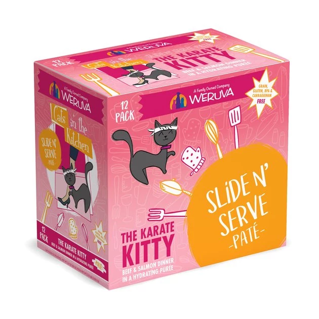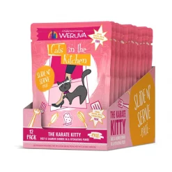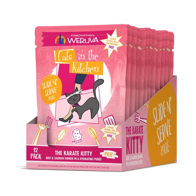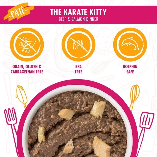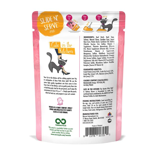 Weruva Cats in the Kitchen The Karate Kitty Beef & Salmon Pate Grain-Free Cat Food Pouches deliver delicious, quality food designed with your kitty’s health in mind. This tasty blend of beef and salmon is sure to have even your picky kitty showing off her karate kicks in delight! Simple, wholesome ingredients are gently pureed into this food’s creamy texture. You won’t find any grain, gluten, MSG or artificial flavors or colors here – just purr-fectly great natural flavors. When your cat just can’t wait for breakfast and is eagerly showing off her karate moves between your legs, this pouch will save you time. Just open it up and slide the food into your furbaby’s dish. Best of all, these pouches are recyclable, so you’re supporting both your kitty’s health and the planet’s health, too.