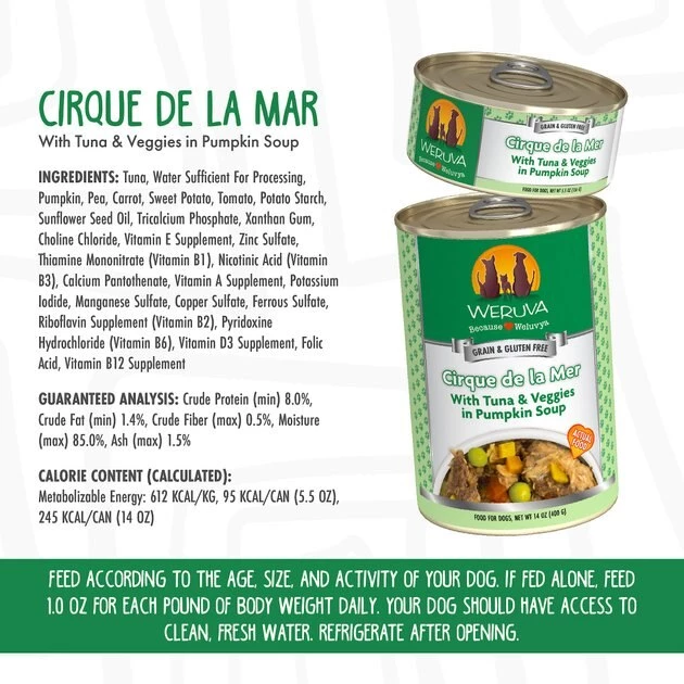- All of Weruva’s dog food formulas are formulated with the carnivore in mind, so this recipe focuses on high quality protein, minimal carbs and a high moisture content for the most nutritious meal around for your pup.