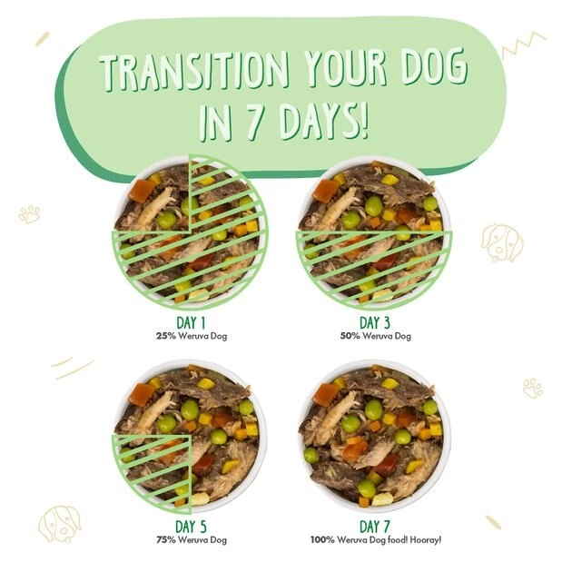 Weruva always recommends switching your cat or dog’s diet slowly and to adjust according to your pet’s digestive stability. Typically, a 6 day transition suites most pet’s needs. We recommend feeding a mix of 25% Weruva & 75% of the previous food for the first 2 days. For the next 2 days, feed 50% Weruva & 50% of the previous diet. Days 5 & 6, Feed 75% Weruva with 25% of the previous diet. Your pet should be fully adjusted to an exclusive high-quality Weruva diet thereafter.