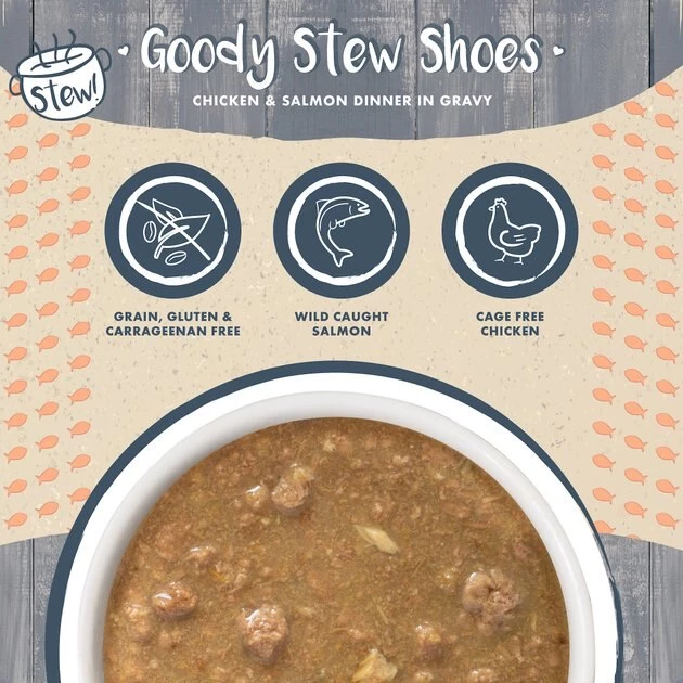 - Hearty chicken and salmon stew with paw-lickin’ good gravy.