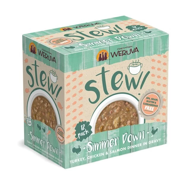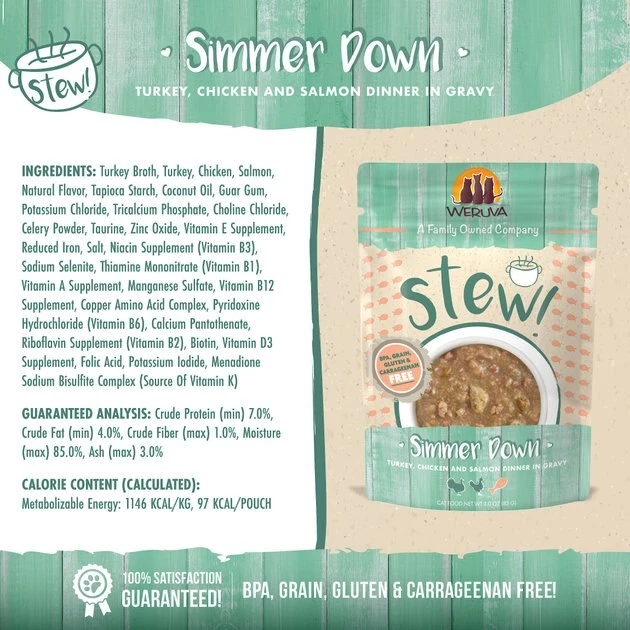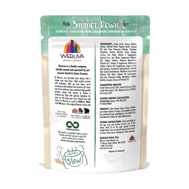 Treat your kitty to a paw-licking good feast at every mealtime with Weruva Classic Cat Down Turkey, Chicken & Salmon in Gravy Stew. The recipe features a filling mix of chicken, turkey and salmon covered in a creamy gravy. The thoughtfully combined ingredients provide essential nutrients and plenty of the moisture she needs to be happy. You won’t find grain, gluten or other undesirable additives in this stew. Serving and storing are easier than ever with the pouch containers. Be sure to recycle when you’re done filling her bowl!