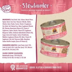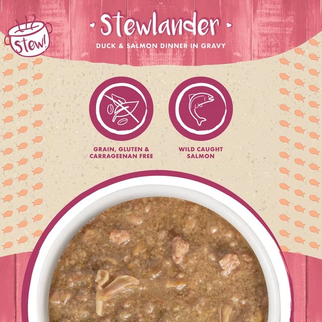 - Hearty duck and salmon stew with paw-lickin’ good gravy.