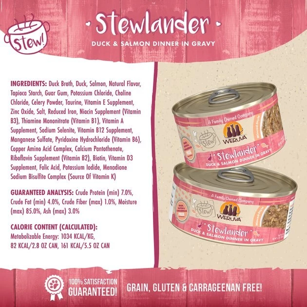 “Wetness is the essence of beauty,” says your su-paw model kitty when she tries Weruva’s Classic Cat Stewlander Duck & Salmon in Gravy Stew Wet Canned Cat Food. This unique recipe is made with delicious duck and salmon cloaked in a paw-licking good gravy. You’ll be paw-leased to know every bite is loaded with vitamins, minerals, omegas and antioxidants—no grain, gluten, artificial flavors or other undesirable additives. It also has the purr-fect amount of moisture she needs to be happy and healthy. This meal comes in two sizes so you can choose the right portion size for your kitty.