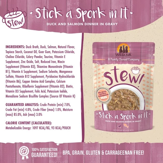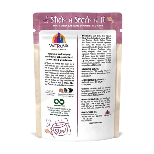 Your quest to find a su-paw meal for your furbaby is complete now that you’ve discovered Weruva Classic Cat Stick a Spork in It Duck & Salmon in Gravy Stew. The recipe features a filling mix of duck and salmon covered in a creamy gravy. The thoughtfully combined ingredients provide essential nutrients and plenty of moisture she needs to be happy. You won’t find grain, gluten or other undesirable additives in this stew. Serving and storing are easier than ever with the pouch containers. Be sure to recycle when you’re done filling her bowl!