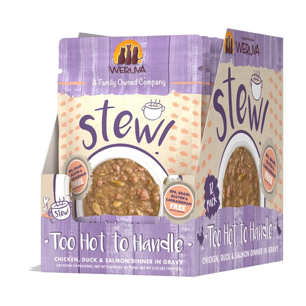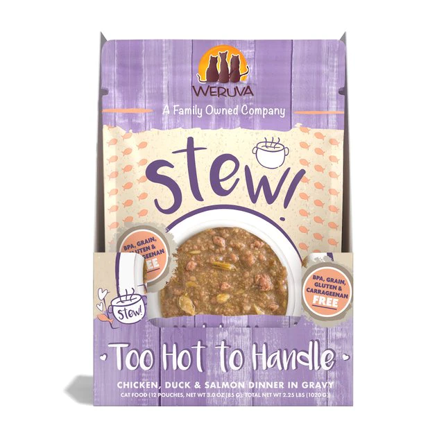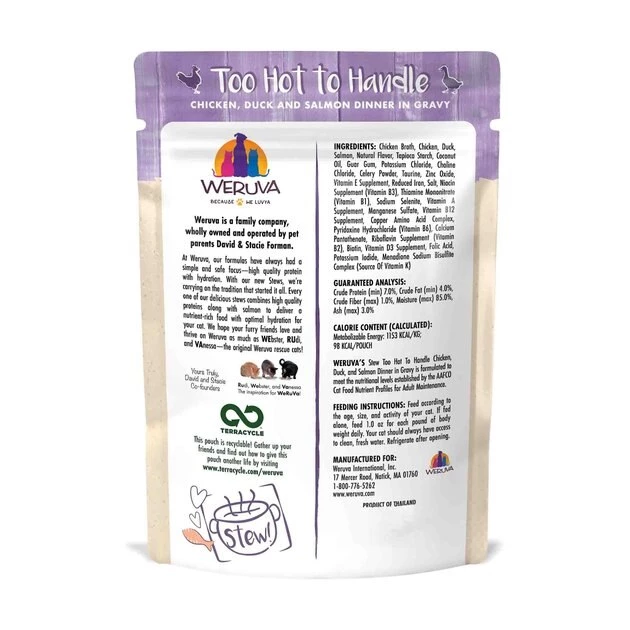 Your kitty knows she’s absolutely paw-fect and you can serve her a meal worthy of her flawless status—Weruva Classic Cat Too Hot to Handle Chicken, Duck & Salmon in Gravy Stew. This recipe features a filling mix of chicken, duck and salmon covered in a creamy gravy. The thoughtfully combined ingredients provide essential nutrients and plenty of moisture she needs to be happy. You won’t find grain, gluten or other undesirable additives in this stew. Serving and storing are easier than ever with the pouch containers. Be sure to recycle when you’re done filling her bowl!