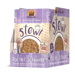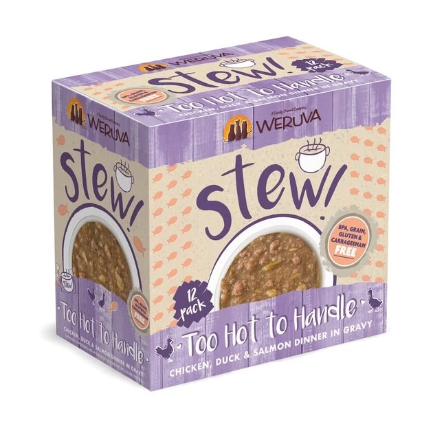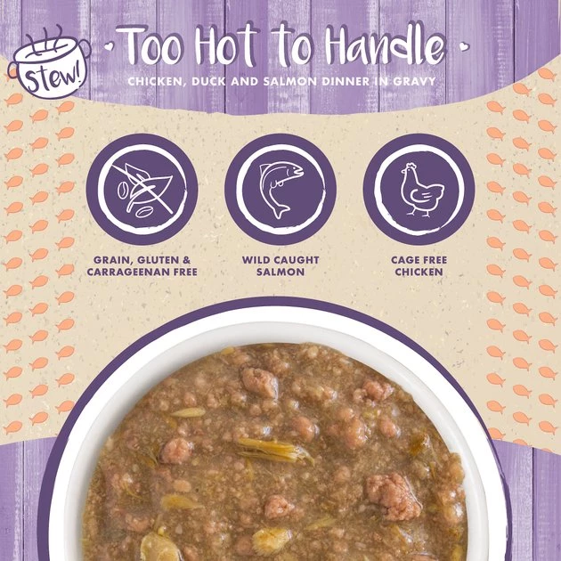 - Hearty chicken, duck and salmon stew with paw-lickin’ good gravy.