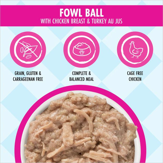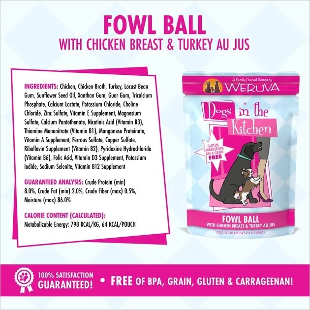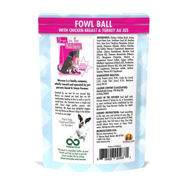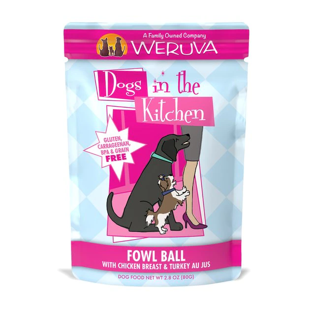 Weruva Dogs in the Kitchen Fowl Ball Dog Food Pouches provide a yummy home cooked meal in a perfectly portioned serving. This luxurious, natural pet food is made from the best ingredients around the world including fresh, high-quality chicken breast and turkey. As with all of Weruva’s Dogs in the Kitchen recipes, the ingredients in Fowl Ball maintain their natural look and recognizable texture, so what you see is exactly what you – and your pup – get!