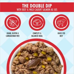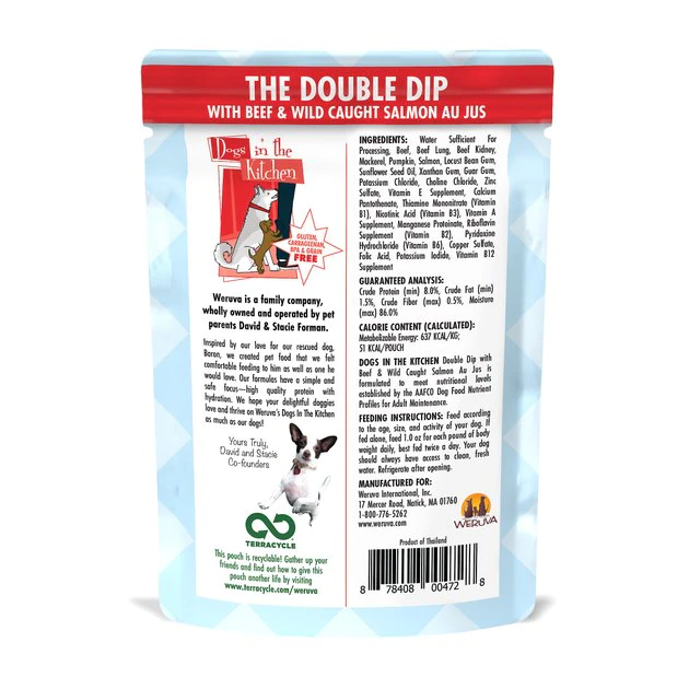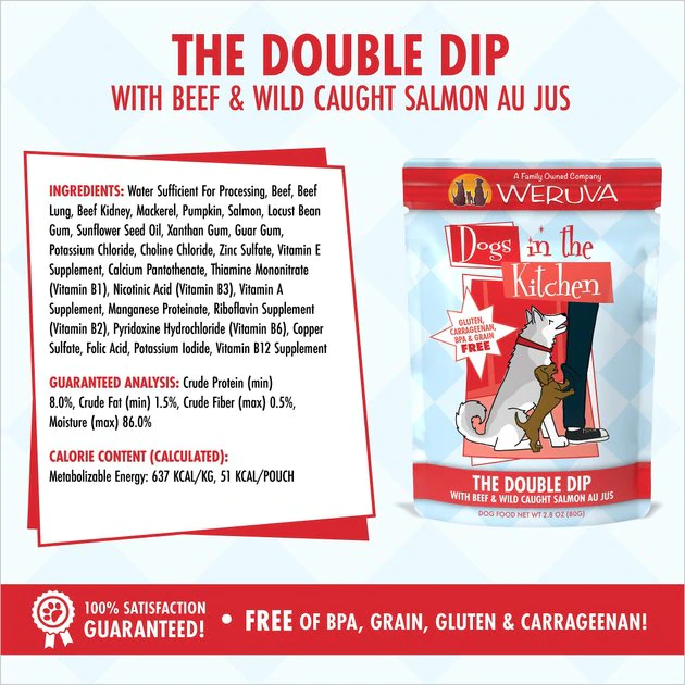 Weruva Dogs in the Kitchen The Double Dip Dog Food Pouches provide a yummy home cooked meal in a perfectly portioned serving. This luxurious, natural pet food is made from the best ingredients around the world including fresh, high-quality beef and wild caught salmon. As with all of Weruva’s Dogs in the Kitchen recipes, the ingredients in The Double Dip maintain their natural look and recognizable texture, so what you see is exactly what you – and your pup – get!