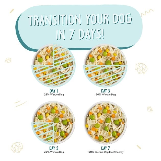 Weruva always recommends switching your cat or dog’s diet slowly and to adjust according to your pet’s digestive stability. Typically, a 6 day transition suites most pet’s needs. We recommend feeding a mix of 25% Weruva & 75% of the previous food for the first 2 days. For the next 2 days, feed 50% Weruva & 50% of the previous diet. Days 5 & 6, Feed 75% Weruva with 25% of the previous diet. Your pet should be fully adjusted to an exclusive high-quality Weruva diet thereafter.