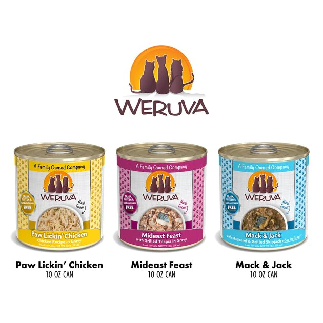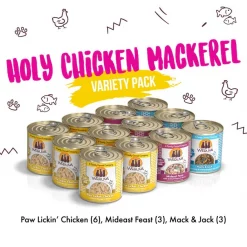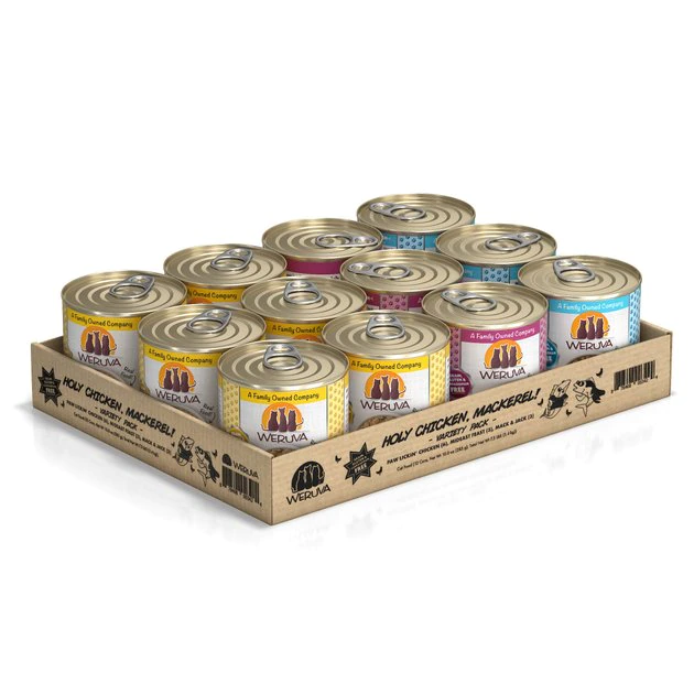 Feed your cat like a member of the family with the Weruva Holy Chicken Mackerel Variety Pack Grain-Free Canned Cat Food. Inspired by the family kitchen, which is the heart of the home, each gourmet recipe is made with love and care to keep your feline feeling great. Also known as “people food for pets,” Weruva uses only the best ingredients that are high in protein—just the way your tiny carnivore needs it. And not only are they delicious and full of complete and balanced nutrition, but the easy-to-serve cans are an excellent way to supply your cat with necessary hydration to keep him thriving. Plus, he’ll love the variety of tasty ingredients, like cage-free chicken, tuna and mackerel!