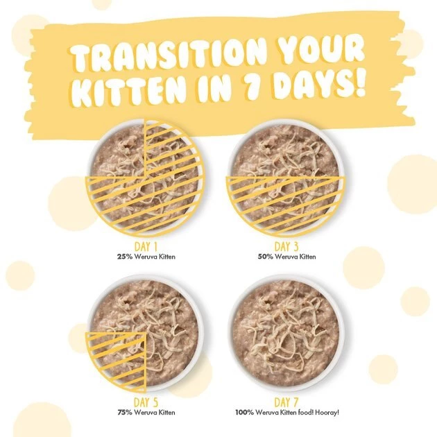 Despite how much your cat or dog asks for Weruva�s high-quality foods, it�s best to transition them gradually onto a new food over the course of one week. Start by mixing a small amount of Weruva in with their old food and slowly increase the proportion of Weruva over 7 days to help your pet adjust.