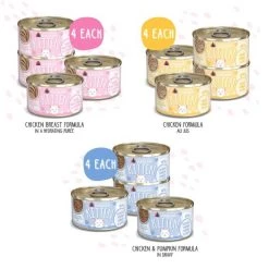 Start your kitten’s diet off right with the Weruva Kitten Fur Baby Favorites Chicken Flavored Shredded Wet Cat Food Variety Pack. This collection of wholesome recipes is specially formulated to support your growing kitten both physically and mentally. Like all Weruva recipes, each kitten formula features high-quality proteins from real meat plus a high moisture content to help keep your little one hydrated, happy and healthy. Always free of grain, gluten, carrageenan or any artificial flavors, you can be confident your little loved one is getting high-quality nutrition from the start!