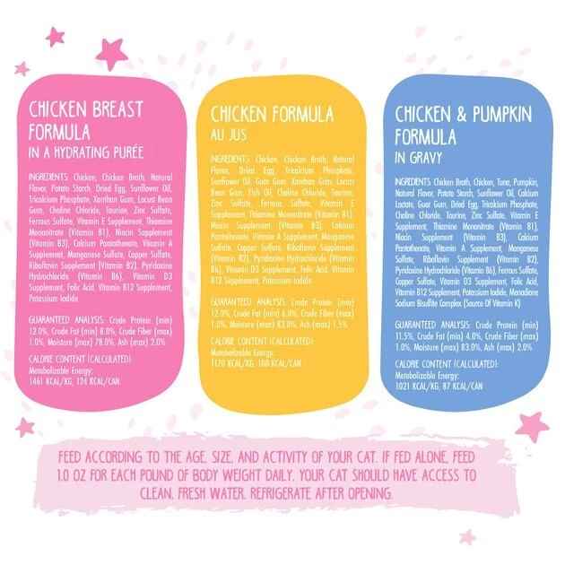 Chicken Formula Au Jus Chicken, Chicken Broth, Natural Flavor, Dried Egg, Tricalcium Phosphate, Sunflower Oil, Guar Gum, Xanthan Gum, Locust Bean Gum, Fish Oil, Choline Chloride, Taurine, Zinc Sulfate, Ferrous Sulfate, Vitamin E Supplement, Thiamine Mononitrate (Vitamin B1), Niacin Supplement (Vitamin B3), Calcium Pantothenate, Vitamin A Supplement, Manganese Sulfate, Copper Sulfate, Riboflavin Supplement (Vitamin B2), Pyridoxine Hydrochloride (Vitamin B6), Vitamin D3 Supplement, Folic Acid, Vitamin B12 Supplement, Potassium Iodide. Chicken & Pumpkin Formula In Gravy: Chicken Broth, Chicken, Tuna, Pumpkin, Natural Flavor, Potato Starch, Sunflower Oil, Calcium Lactate, Guar Gum, Dried Egg, Tricalcium Phosphate, Choline Chloride, Taurine, Zinc Sulfate, Vitamin E Supplement, Thiamine Mononitrate (Vitamin B1), Niacin Supplement (Vitamin B3), Calcium Pantothenate, Vitamin A Supplement, Manganese Sulfate, Riboflavin Supplement (Vitamin B2), Pyridoxine Hydrochloride (Vitamin B6), Ferrous Sulfate, Copper Sulfate, Vitamin D3 Supplement, Folic Acid, Vitamin B12 Supplement, Potassium Iodide, Menadione Sodium Bisulfite Complex (Source Of Vitamin K). Chicken Breast Formula In A Hydrating Puree: Chicken, Chicken Broth, Natural Flavor, Potato Starch, Dried Egg, Sunflower Oil, Tricalcium Phosphate, Xanthan Gum, Locust Bean Gum, Choline Chloride, Taurine, Zinc Sulfate, Ferrous Sulfate, Vitamin E Supplement, Thiamine Mononitrate (Vitamin B1), Niacin Supplement (Vitamin B3), Calcium Pantothenate, Vitamin A Supplement, Manganese Sulfate, Copper Sulfate, Riboflavin Supplement (Vitamin B2), Pyridoxine Hydrochloride (Vitamin B6), Vitamin D3 Supplement, Folic Acid, Vitamin B12 Supplement, Potassium Iodide.