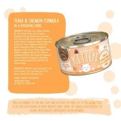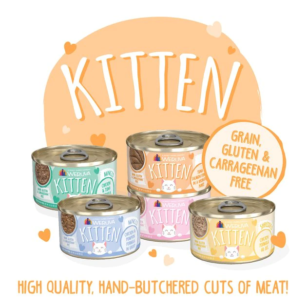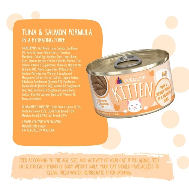 Your kitty will pounce on Weruva Kitten, Tuna & Salmon Formula in a Hydrating Purée Wet Cat Food! This delicious medley of tuna and salmon is fortified with essential vitamins and minerals to support your kitten’s physical and mental growth. Each delightful dish offers the lean protein and moisture your furbaby needs to thrive. Weruva cat food is produced in human food facilities following strict global standards to ensure high quality meals for your precious puddy. Plus, it contains no by-products, corn, carrageenan, gluten, grain, soy or artificial colors and preservatives.