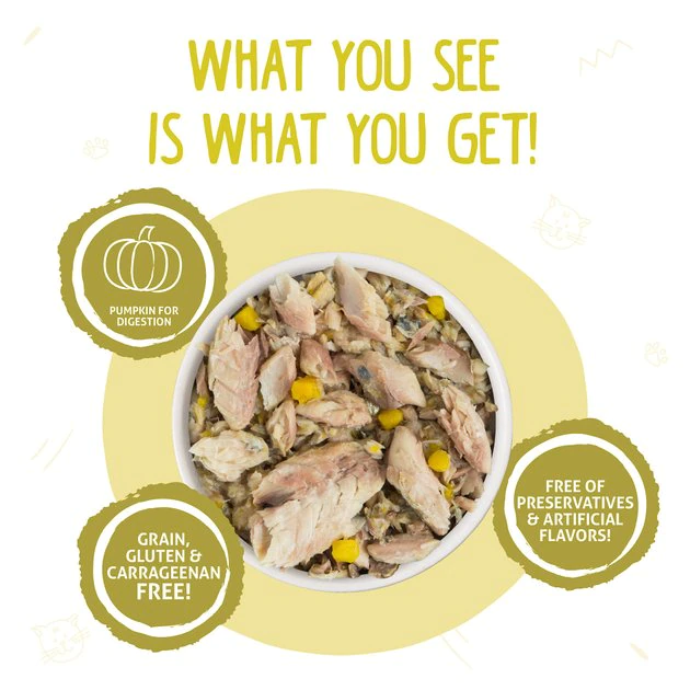 - Grain-free wet food is made with mackerel and pumpkin as the top ingredients so it’s high in protein sourced from real meat.