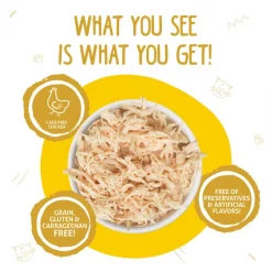 - Grain-free wet food is made with shredded chicken as the first ingredient so it’s high in protein sourced from real meat.