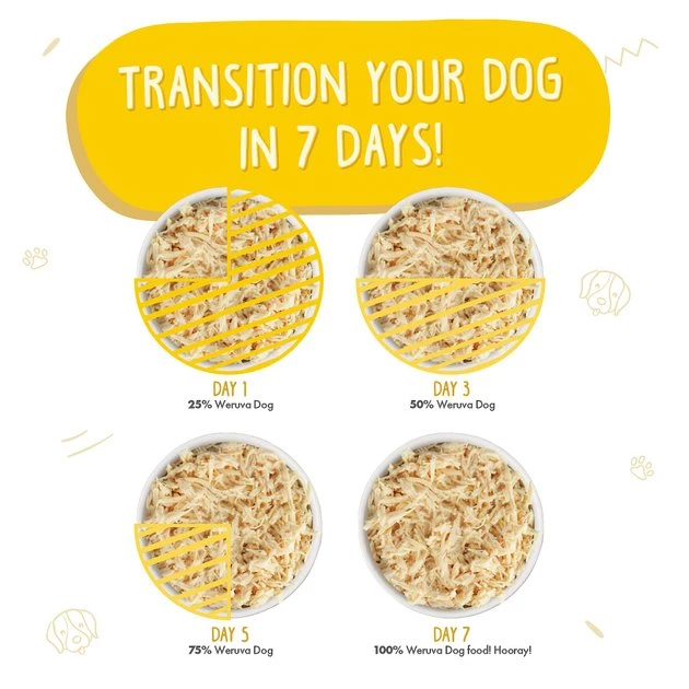 Weruva always recommends switching your cat or dog’s diet slowly and to adjust according to your pet’s digestive stability. Typically, a 6 day transition suites most pet’s needs. We recommend feeding a mix of 25% Weruva & 75% of the previous food for the first 2 days. For the next 2 days, feed 50% Weruva & 50% of the previous diet. Days 5 & 6, Feed 75% Weruva with 25% of the previous diet. Your pet should be fully adjusted to an exclusive high-quality Weruva diet thereafter.