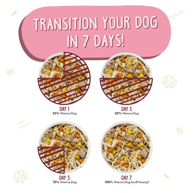 Weruva always recommends switching your cat or dog’s diet slowly and to adjust according to your pet’s digestive stability. Typically, a 6 day transition suites most pet’s needs. We recommend feeding a mix of 25% Weruva & 75% of the previous food for the first 2 days. For the next 2 days, feed 50% Weruva & 50% of the previous diet. Days 5 & 6, Feed 75% Weruva with 25% of the previous diet. Your pet should be fully adjusted to an exclusive high-quality Weruva diet thereafter.
