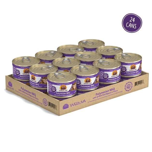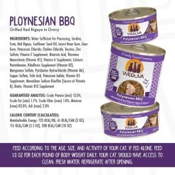 Bring some delicious nutrition to your kitty’s bowl with Weruva Polynesian BBQ with Grilled Red Bigeye Grain-Free Canned Cat Food. Made with sardines and Bigeye tuna from Pacific waters as the first ingredients, every bite is loaded with the meat your little carnivore craves, and all the protein he needs for healthy muscles. Since it’s formulated with a perfectly-balanced blend of vitamins, minerals and heart-healthy taurine, every easy-open can is actually a complete meal—on its own or as a tasty kibble topper. It’s no wonder that for cats everywhere, Weruva is also known as “the best cat food under the sun!”